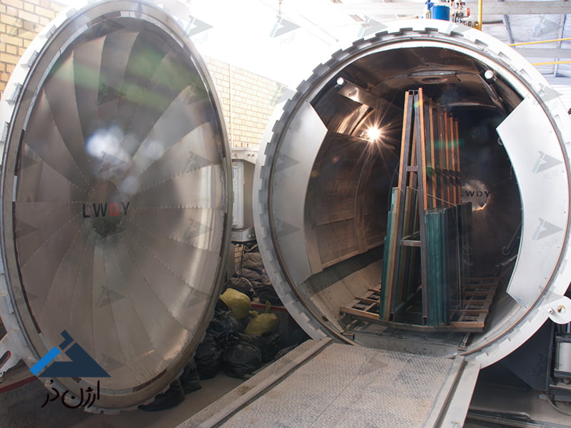 - پس از سکوریت شدن، لایههای PVB بین شیشهها قرار میگیرد و در دستگاه لمینت، این لایهها با پرس به یکدیگر متصل میشوند. در پایان، شیشهها وارد کوره اتوکلاو شده و در دمای حدود ۱۵۰ درجه، لایهها بهطور کامل به هم میچسبند.